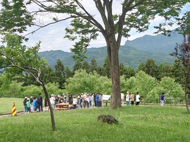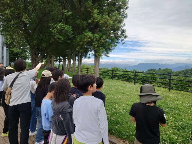 川場移動教室5年生は、赤城高原サービスエリアでトイレ休憩をし、高原の空気を吸って景色を楽しんでいます。谷川岳や武尊山が見えます。順調に進んでいます。