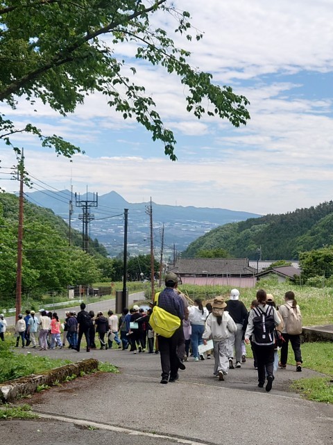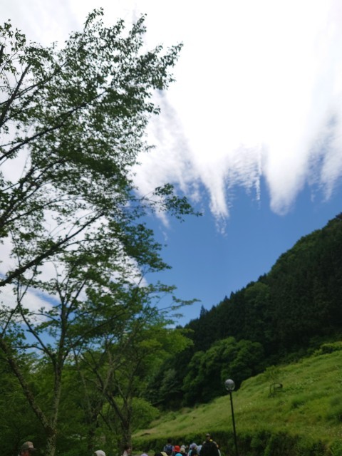 里山入門で、宿舎の周辺を歩いています。今日は空と雲がとてもきれいです。茅葺き屋根の民家で昔の人の暮らしについても話を聞きました。
