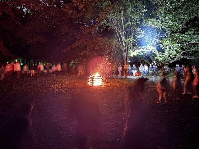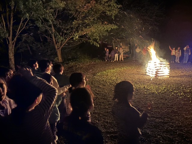 キャンプファイヤーが始まりました。風が吹くと炎が勢いよく燃え上がり、火の粉が舞いました。火の子が「友情の火」「努力の火」という言葉に続いてクラス全体で声をあげました。ゲームやダンスで楽しく過ごしました。