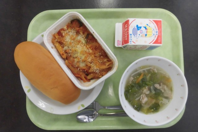 今日の主菜は、なすのミートグラタンです。夏野菜のひとつである「なす」を使った料理です。今日のなすは油で一度揚げているので味もまろやかになっています。