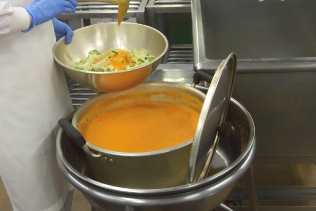 今日の副菜は、キャロットソースサラダです。すりおろした人参と油や酢、からしなどの調味料を混ぜたソースを野菜の上からかけました。サラダとハッシュドポークライスに入っている人参は、「有機野菜」です。
