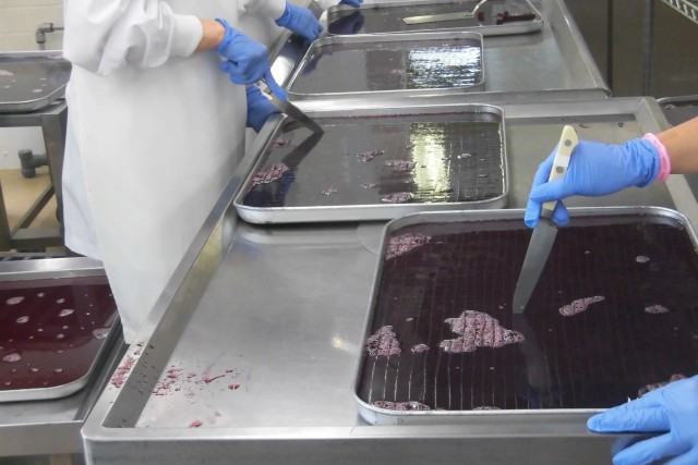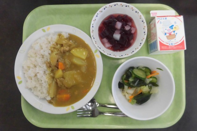 今日のデザートはあじさいゼリーです。今日は、ぶどうジュースとカルピスで作ったゼリーを四角に切り、あじさいの花をイメージして作りました。見た目からも季節を感じてほしいと思います。