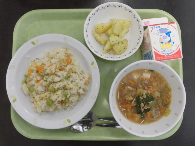 今日の主食は、枝豆とじゃこのチャーハンです。枝豆は、6月の終わりから8月ごろが旬の食べ物です。副菜の青のりポテトは、オーブンで焼いて調理しました。