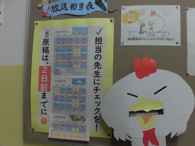 今朝は委員会紹介集会がありました。3つの委員会が、短い寸劇やクイズを取り入れて、活動内容を分かりやすく伝えました。放送委員会からは、放送委員会のキャラクターに名前をつけてほしい、という話がありました。放送室の前の掲示板に、今はまだ名前のないキャラクターが貼ってあります。みなさん、名前を考えてくださいね。