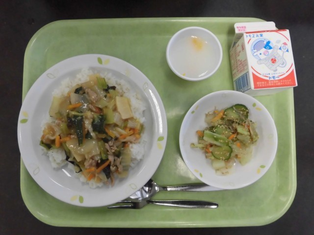 今日の主菜・主食は、鶏肉と青菜の中華丼です、中華丼に入っている小松菜は、東京都産のものを使っています。実は、東京都で収穫される小松菜の生産量は、全国で第4位とランキングの上位になるくらいたくさん生産されています。