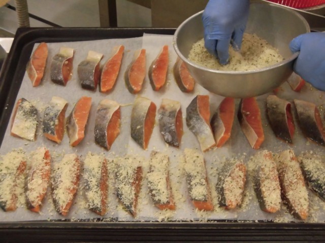 今日のスープは、白いんげん豆の田舎風スープです。フランスでよく作られているスープで、フランス語では、煮込みを意味する「ガルビュール」という名前の料理です。写真は、魚のパン粉焼きを作っている様子です。