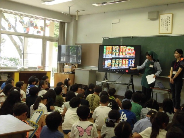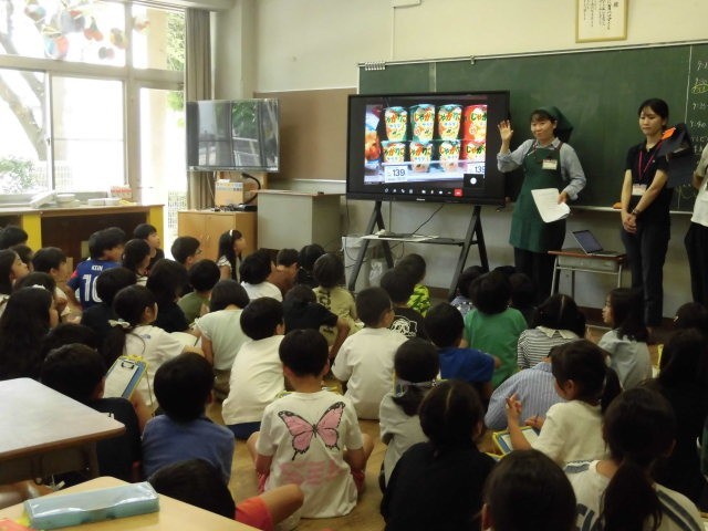 3年生の社会科でスーパーマーケットの見学の授業です。とはいっても実際に出かけていくのではなくて、3年生の先生がそのスーパーに行って、オンライン中継をし、お店の方が学校に来てくださって、お店の映像を見ながらお話をしてくださるという形の見学です。学校の近くのスーパーの方が、お忙しいなか学校まで来てくださり、子どもたちにお話しをしてくださいました。バックヤード、棚の裏側などふだん見ることのできない場所を見せていただきました。3年生はとても興味深そうにお話を聞いていました。ご協力いただきありがとうございました。