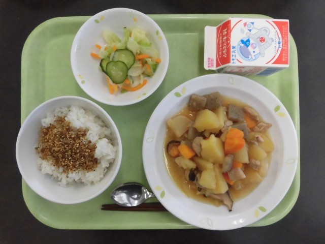 今日のふりかけは、じゃことかつお節、ごま、青のりをごま油で炒めて、しょうゆで味をつけて作りました。よく噛んでしっかり食べましょう。