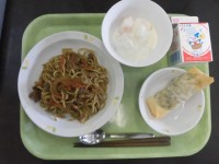 ★今日の献立・ソース焼きそば・棒ぎょうざ・フルーツヨーグルト・牛乳 今日の主菜は...