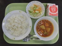 ★今日の献立・麦ごはん・スープカレー・キャベツとチーズのサラダ・ぶどうゼリー・牛...