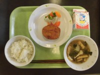 ★今日の献立・ミルクパン・ハンバーグ・青菜とポテトのソテー・たまごとキャベツのス...