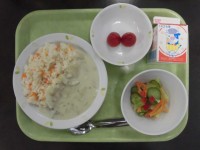 ★今日の献立・キャロットライスのクリームソースかけ・カラフルサラダ・いちご・牛乳...