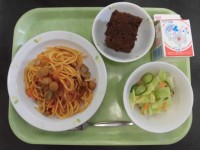 ★今日の献立・スパゲッティナポリタン・フレンチサラダ・チョコケーキ・牛乳 今日の...