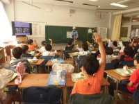 2年生の教室で給食前の時間、栄養士の先生による「食育」の指導がありました。食器の...