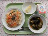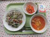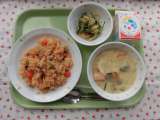 ○今日の献立 ・とりとごぼうのピラフ ・牛乳 ・キャロットポタージュ ...
