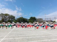 2年生の表です。クラスごとに違った色の旗でダンスをします。一人一人の笑顔とみんな...