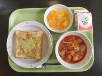 ★今日の献立・ツナコーンチーズトースト・レンズ豆のトマトシチュー・フルーツポンチ...