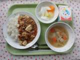 ○今日の献立 ・マーボー豆腐ライス ・牛乳 ・白菜スープ ・フルーツ牛...