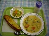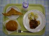 給食のメニューは「ガーリックトースト、コーンシチュー、みかん入りフレンチサラダ、...