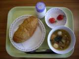 今日の給食のメニューは「きなこ揚げパン、肉だんご入り春雨スープ、いちご、牛乳」で...