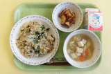 ★今日の献立 ・鶏五目ごはん ・ししゃものからあげ ・おひたし ・えのき入りす...