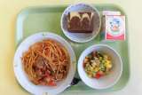 ★今日の献立 ・スパゲッティナポリタン ・イタリアンサラダ ・米粉ココアマーブ...