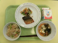 ★今日の献立・たけのこごはん・さばの一味焼き・野菜のからししょうゆかけ・豆腐のす...