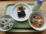 わかめ入りピースごはん(1年さやむき) あじの山河焼き いもっこ汁 たくあんとき...