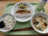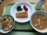 麦ごはん 手作りのりの佃煮 鮭のみそマヨネーズ焼き かきたま汁 きゃべつのおかか...