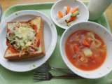 ピザトースト 豆入りミネストローネ 野菜のピクルス 牛乳