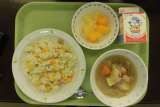 ★今日の献立 ・三色ピラフ ・白いんげん豆の田舎風スープ ・フルーツポンチ ・...