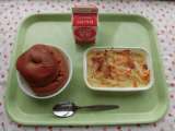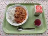 ○今日の献立 ・ポークストロガノフ ・牛乳 ・ぶどうゼリー 給食ではカ...