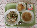 ★今日の献立 ・ひじきピラフ ・牛乳 ・鮭の和風チーズポテト ・野菜スープ ...