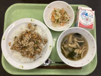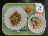 ★今日の献立・チンジャオロース丼・たまご入り中華スープ・冷凍みかん・牛乳 今日の...
