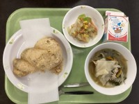 ★今日の献立・揚げパン(きなこ)・ワンタンスープ・ツナコーンサラダ・牛乳 今日の...