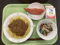 ★今日の献立・ジャージャー麵・ひじきとハムのサラダ・すいか・牛乳 今日の主食は、...