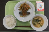 ★今日の献立・むぎごはん・あじのピリ辛ソース・五目きんぴら・みそ汁・牛乳 今日の...