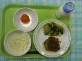 今日のメニューは「とうふ入りハンバーグ、やさいソテー、ご飯、牛乳、プラム」です。...