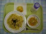 7月1日の給食は、「たらこスパゲティ、ごまドレサラダ、レーズン入りスコーン、牛乳...