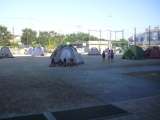 2日目の朝です。校庭のテントでは、目覚めた子どもたちが外に出てきています。全員が...