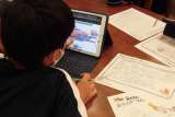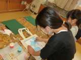 「版画でオリジナルエコバッグづくり」では、好きな絵柄をカッターで切り抜き、スポン...