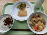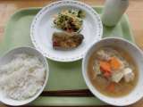 秋のかおりごはん 鶏肉の生姜焼き のっぺい汁 沢庵ときゅうりのごま風味 アップル...