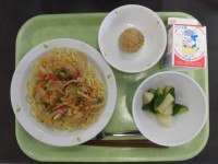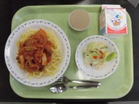 ★今日の献立・スパゲッティ地中海ソース・イタリアンサラダ・カフェオレゼリー・牛乳...
