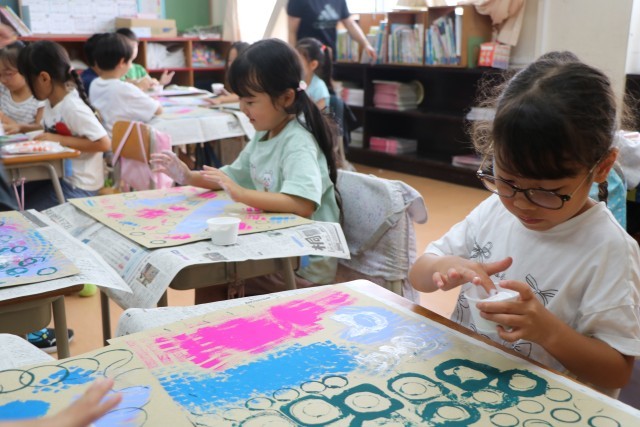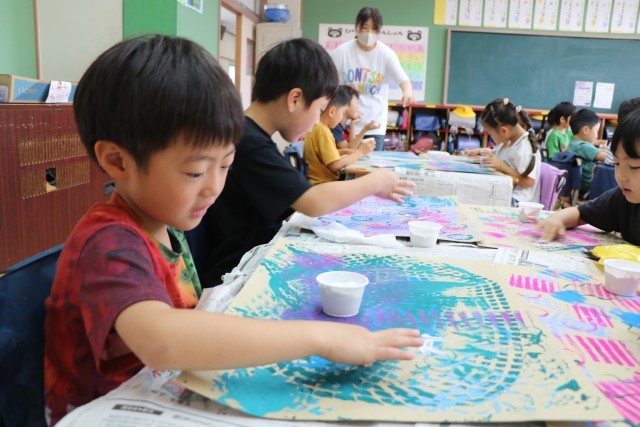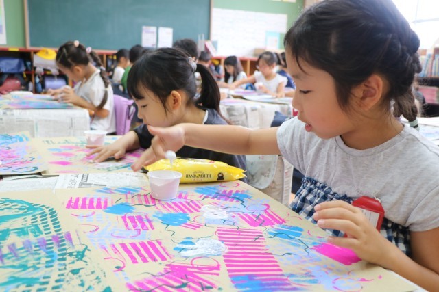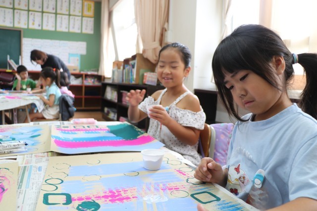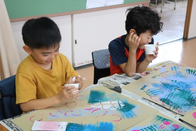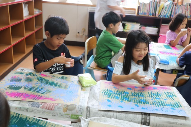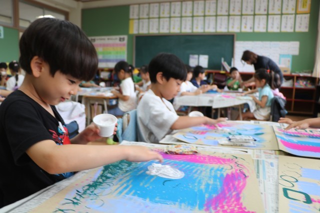 1年生図工「しろちゃん こんにちは」の様子です。前回の図工の時間に彩色を楽しんだ紙に、今日は液体粘土を使って作品を仕上げていきます。どんな「しろちゃん」ができるでしょうか。手触りを楽しみながら取り組んでいます。