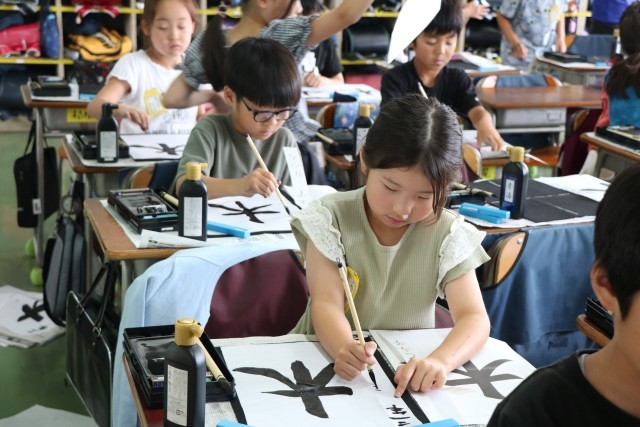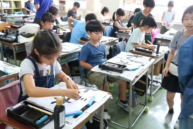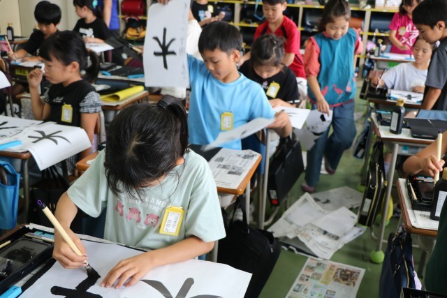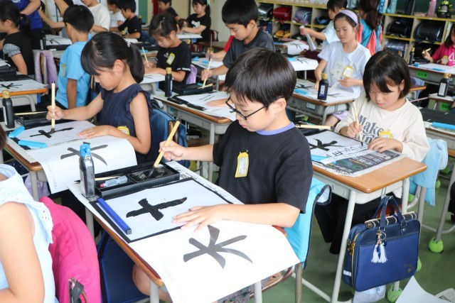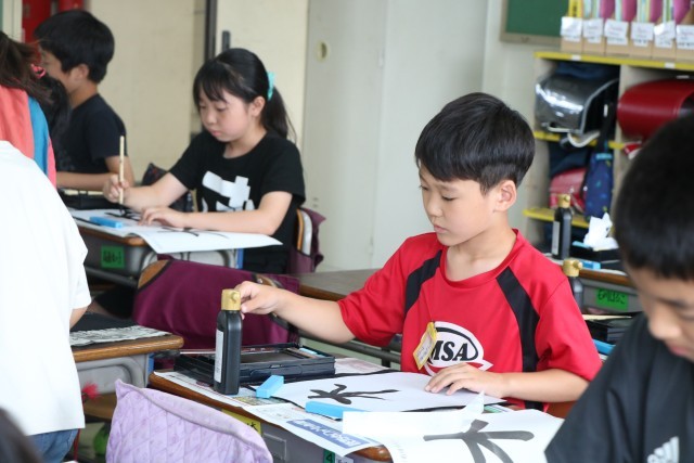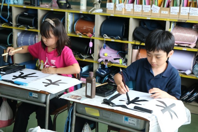 3年生書写の様子です。初めて毛筆が始まった3年生、初めは横画、縦画、おれなどから学習し、今日は左はらい、右はらいを含め1学期最後まとめの学習です。