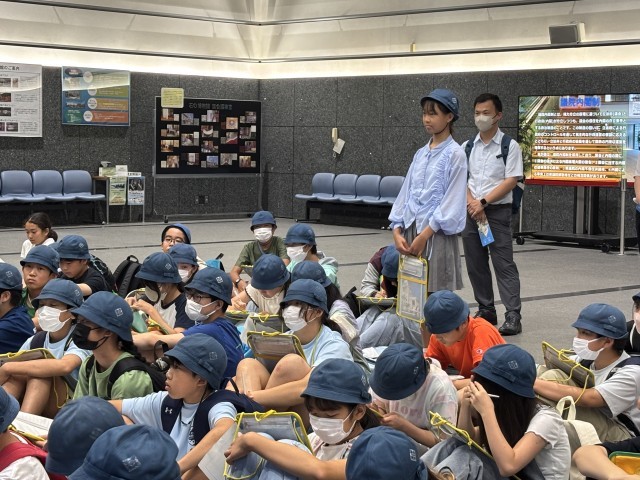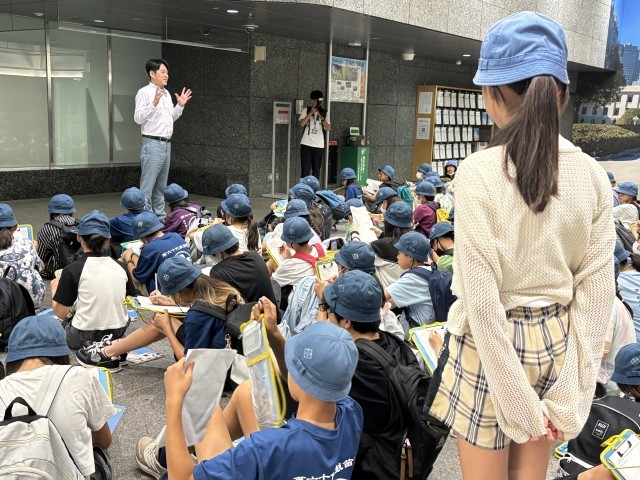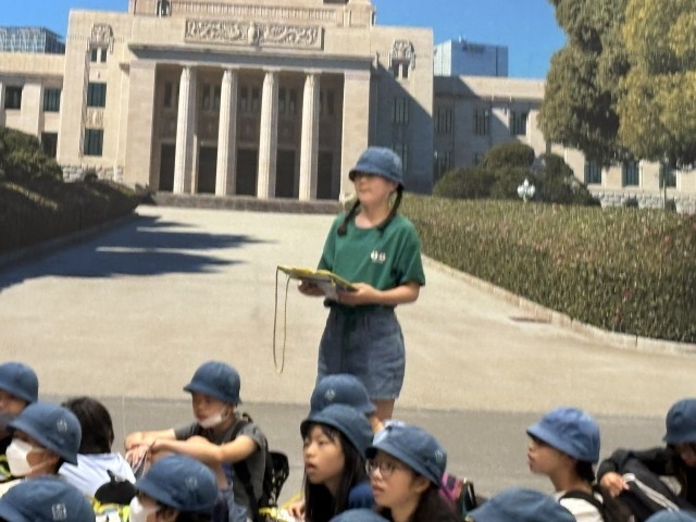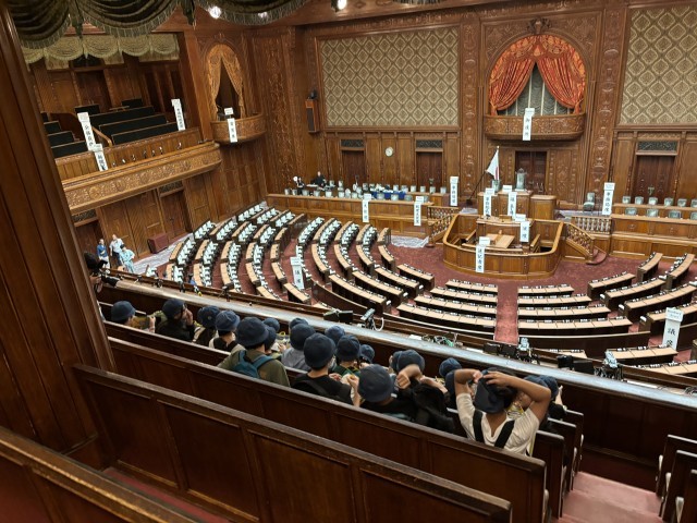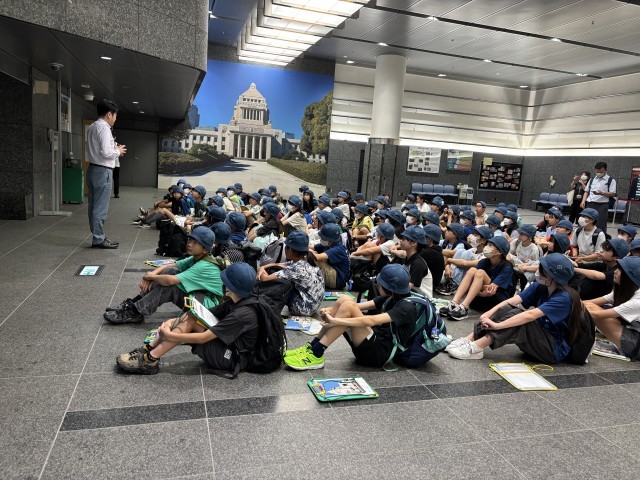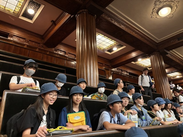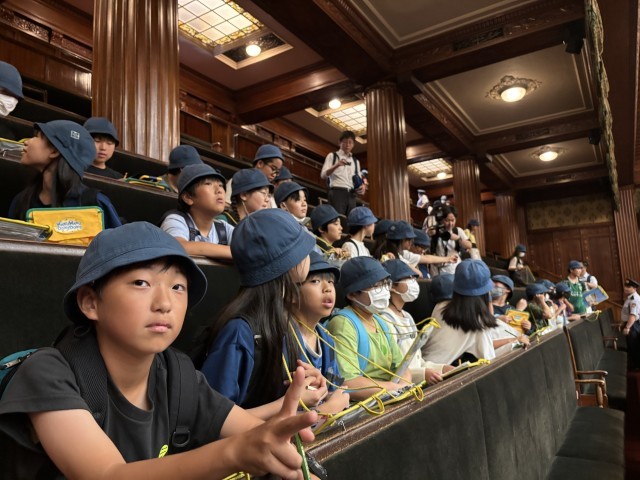が今日の目標です。まず初めに国会見学です。団体見学には議員さんの紹介が必要となり、バスから濡れずに国会に入れるようご配慮くださったり、子どもたちの質問に答えてくださったりお世話になりました。見学者も少ない日でしたのでゆっくり見学し、議場でも座ってゆっくり説明を聞くことができました。