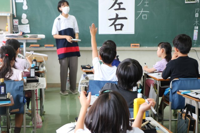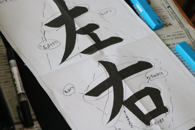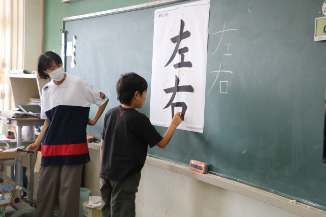 4年生書写の様子です。一度教科書のお手本を見ながら自分なりに「左右」を書きました。お手本をよく見ながら、どんなところに気を付けて書けばいいか、みんなで考えを出し合っています。