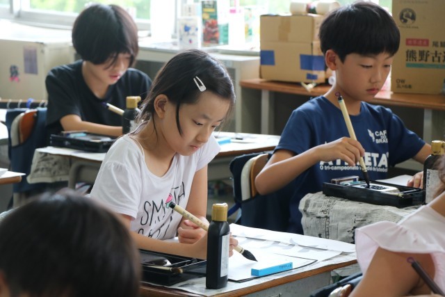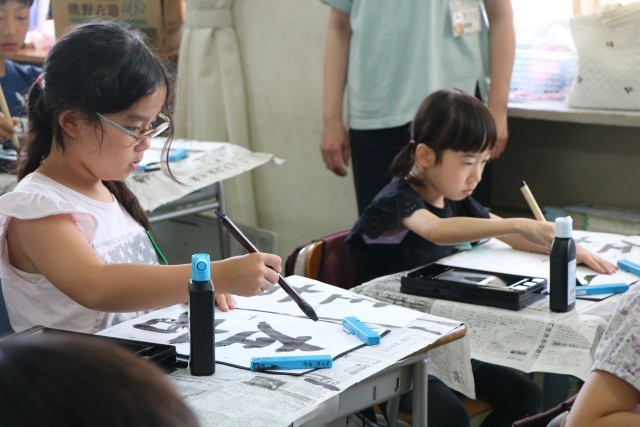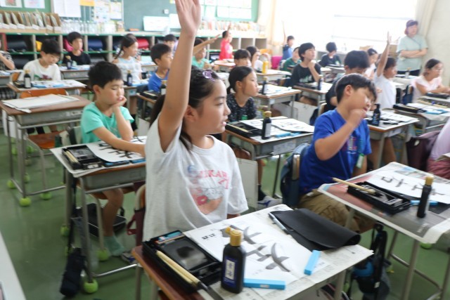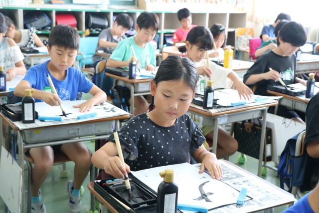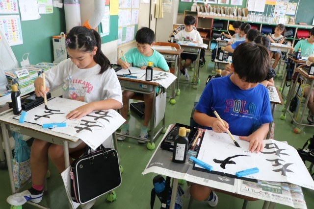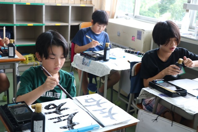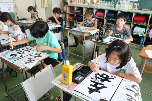 「私も(その意見と)同じです。」など、互いに学びあった後、さあもう一度書きます。集中してポイントを考えながら書いています。自分たちで気が付いたポイントなので、しっかり頭に入っていて、ぐんと上達した良い字が書けています。