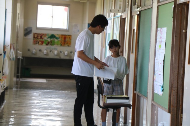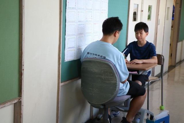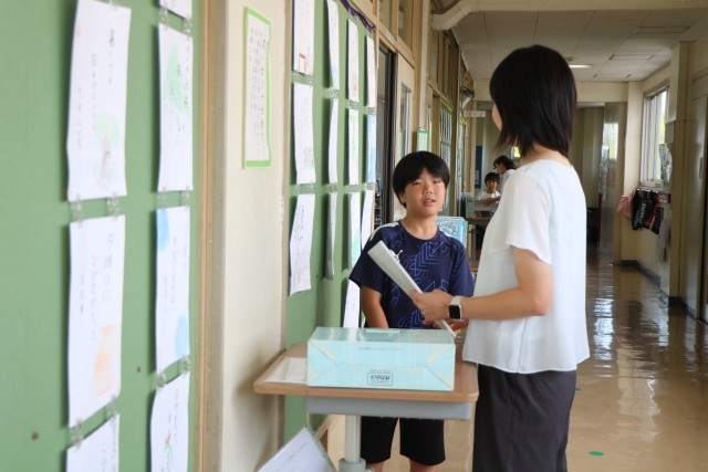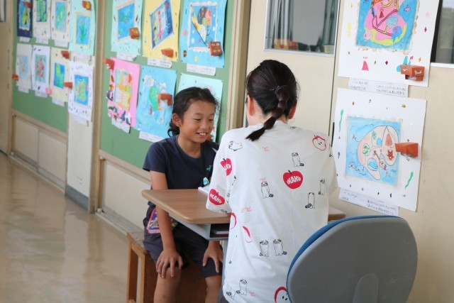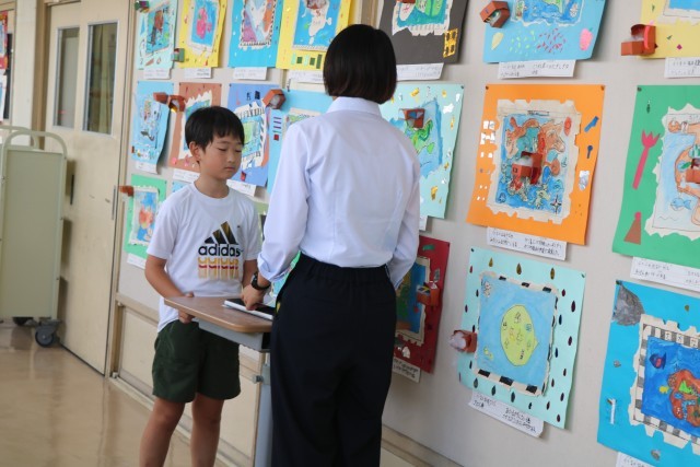 写真は4年生・5年生・6年生の様子です。子どもたちの目線に合わせたり、いっしょに「あゆみ」を見たりしながら1学期を振り返り夏休みの過ごし方、2学期につながるような話をしています。ある担任の先生から後で聞いた話ですが、「自分が一番頑張ったところ、あなたの良さはどんなことだと思っている?」と聞くとなかなか照れてなのか口に出せず、「もっと頑張らなくてはいけないことは?」と聞くと、すらすら出てくる子が多いとか。どのクラスでも担任の先生は「あなたの良いところはね・・・頑張ったところはね・・・」と、たっぷり話したことと思います。ご家庭でも頑張ったことをしっかり価値付けてあげてほしいです。