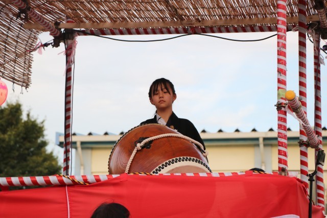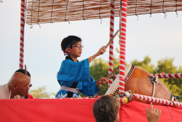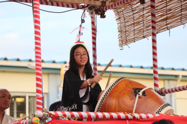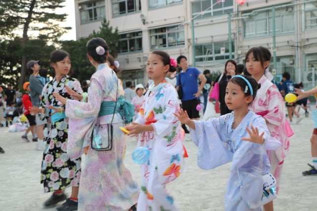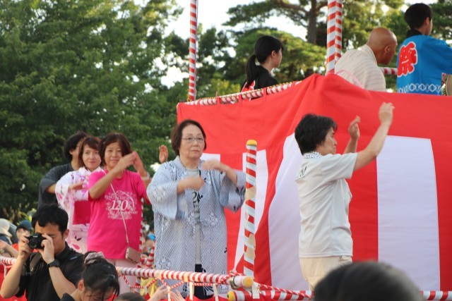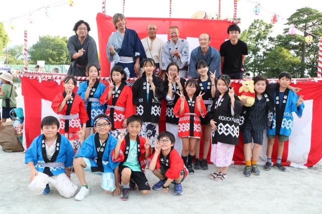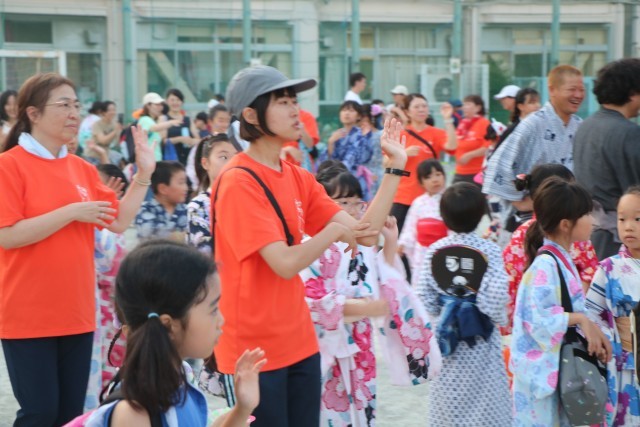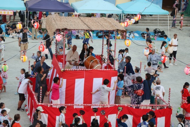 太鼓っ子の太鼓の音と音楽に合わせて、盆踊りも楽しみました。今年は立派な2段の櫓が完成したので、みんな踊りの先生たちの姿を見ながら楽しく一緒に踊りました。